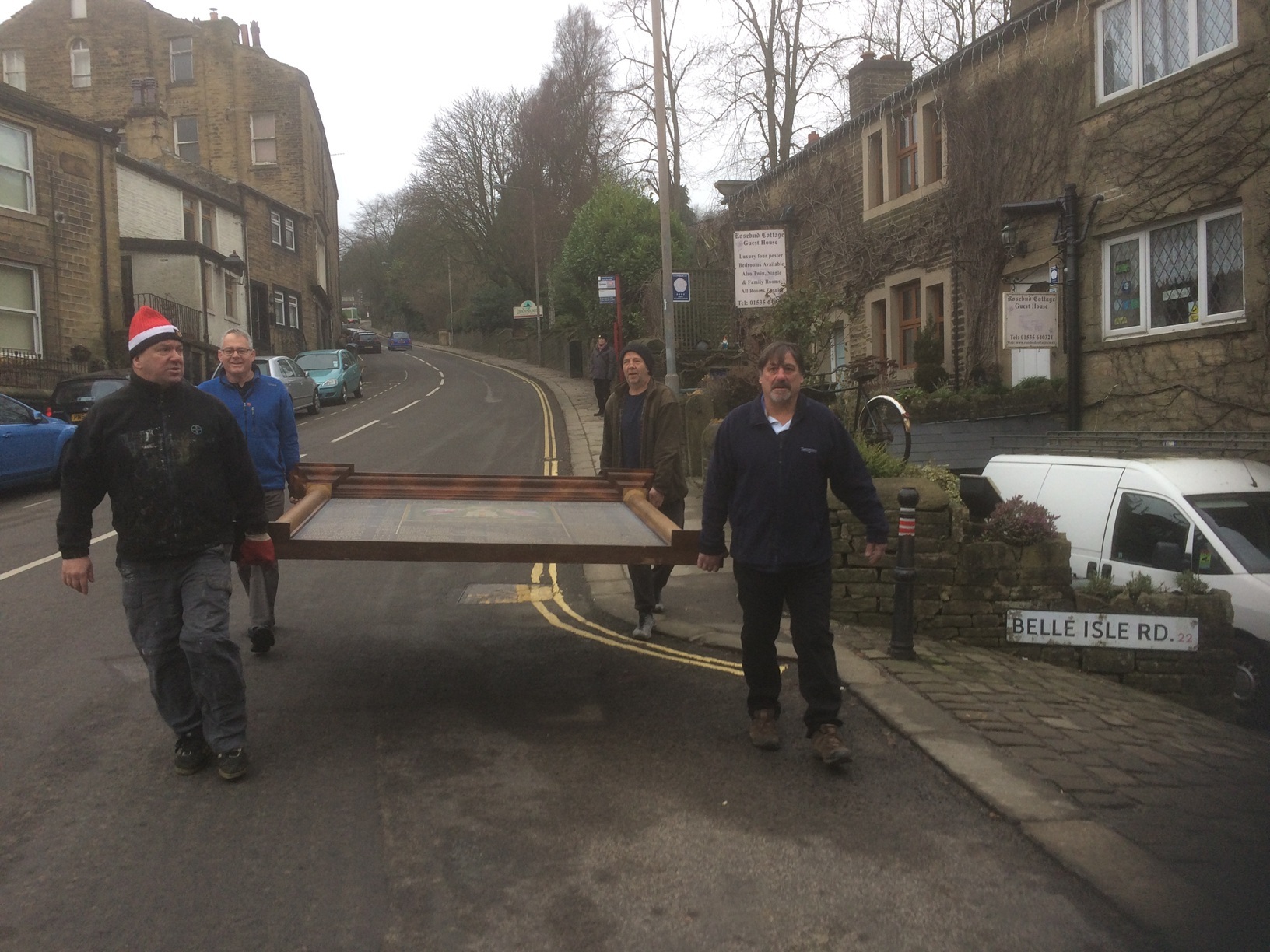 We passed it down and leant it against the wall. we were quite relived that it wasn’t diffcult to move and set about getting it outside into the large van for transportation down the hill to Wyedean. Problem being, it was too large for the van. However, needs must and we were determined to get it to Wyedean that day so four of us took a corner each and carried it a quarter of a mile down the road, walking in the main road for a good part of it! Fortunately the traffic was very light and we made it without incident to the entrance of Wyedean Weaving, having passed the main Haworth War Memorial on the way.