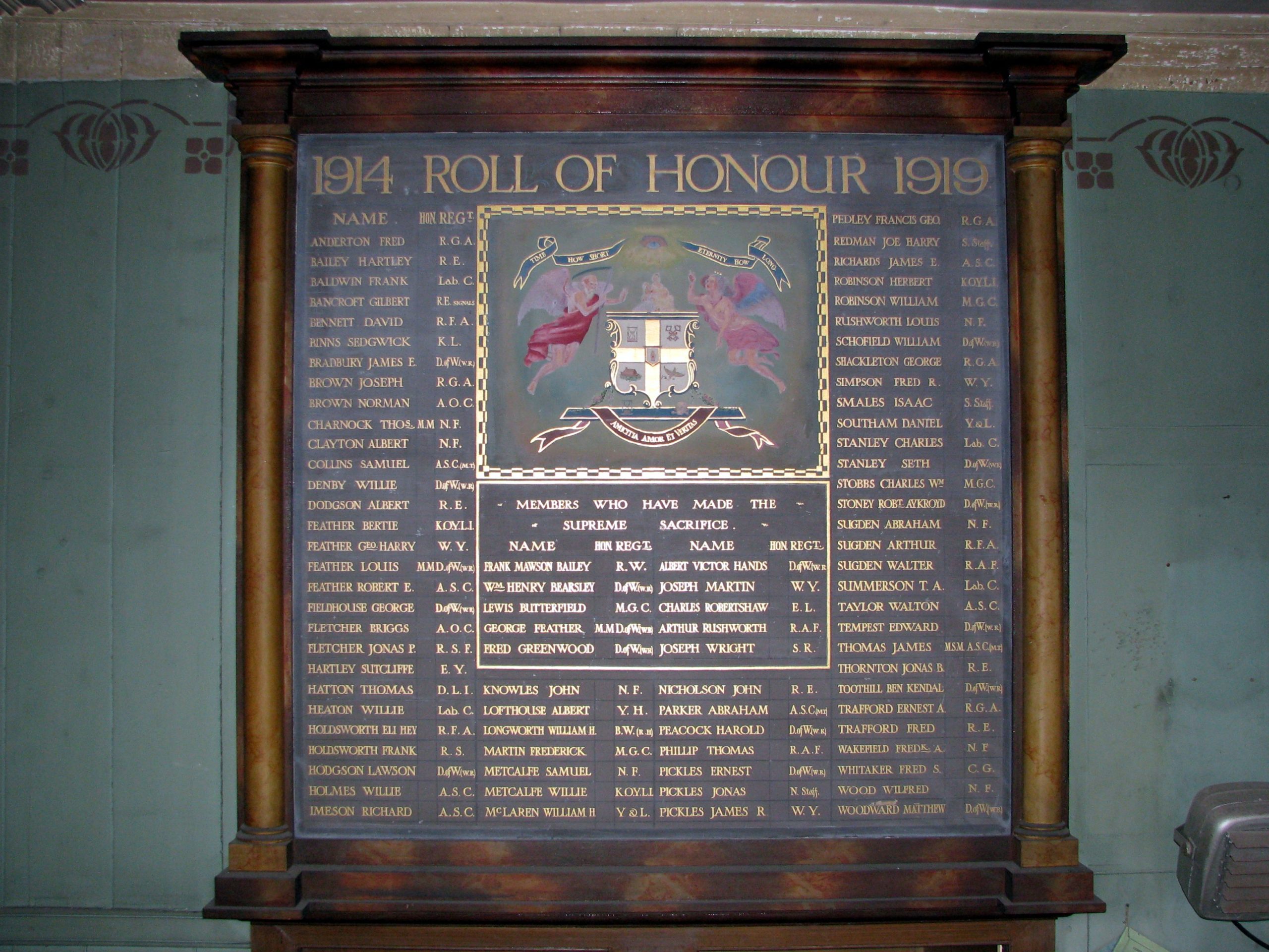 This measures approximately 2.1 metres square and takes the form of an illuminated board with the eighty-three names listed alphabetically in gold lettering, complete with regimental information for each man. The lists show seventy-three of those members who served and returned, with a central section listing the ten members who made the supreme sacrifice in the Great War.