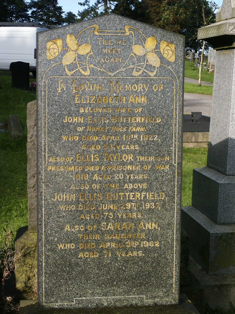 His name appears on the family gravestone in Oakworth Cemetery and reads: “Ellis Taylor their son, presumed died a prisoner of war 1918. Aged 20 years.”