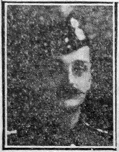 A very poor quality photo from a newspaper in 1917. It is of a man's head and shoulders and it is very dark. We can just make out that he is wearing the glengarry of a scottish regiment with a large badge on one side and a checkered band around the base. This is the glengarry of the Royal Scots Regiment. He also has a moustache with what appear to be waxed tips.