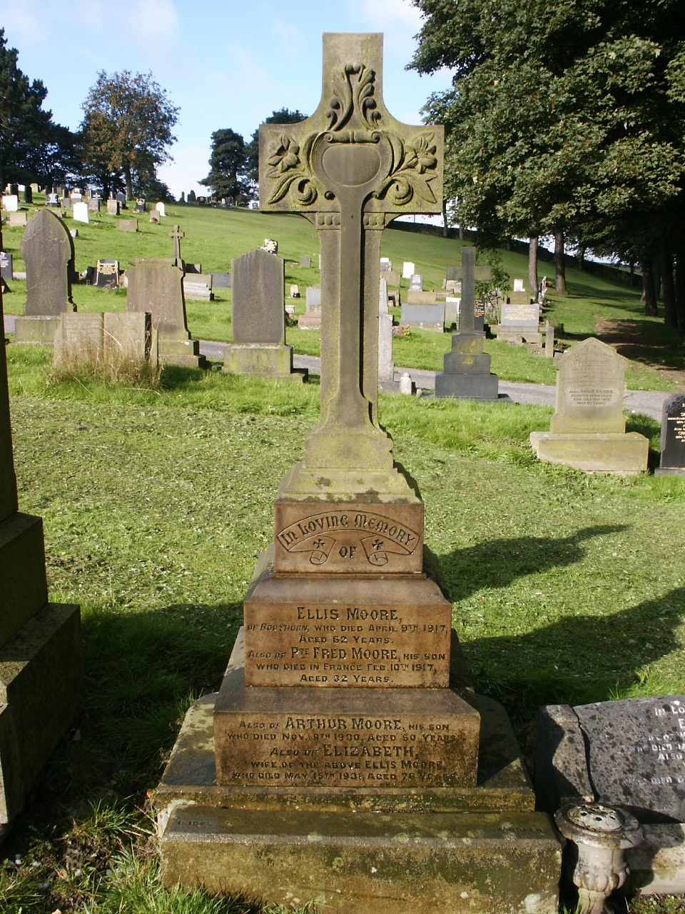 A grave in Oakworth Cemetery. THis is a stepped stone base with a stone cross on top. The inscription reads: Ellis Moore of Bogthorn, Who died Apr 9th 1917 aged 62 years. Also of Pte. Fred Moore, his son, who died in France Feb 10th 1917, Aged 32 years. Also of Arthur Moore, his son, who died Nov. 19th, 1930, aged 50 years. Also of Elizabeth, wife of the above Ellis Moore, who died May 15th, 1938, aged 76 years.