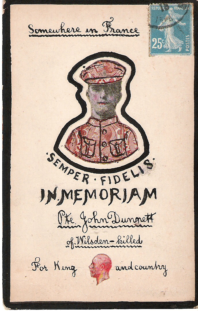 ‘Somewhere in France. Semper Fidelis. In Memoriam. Private John Dunnett of Wilsden. Killed for King and Country.’