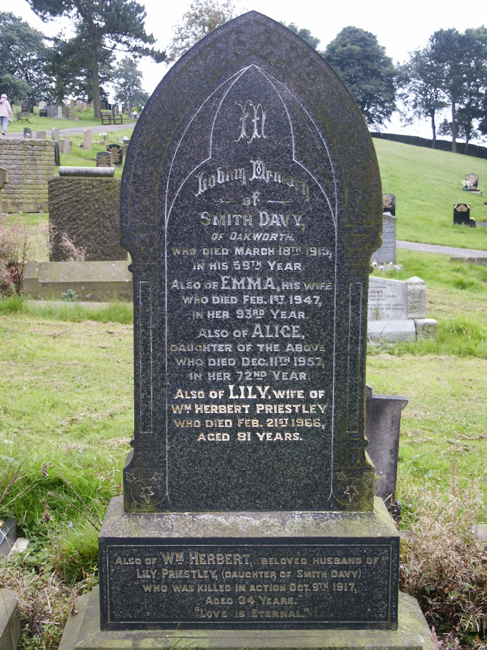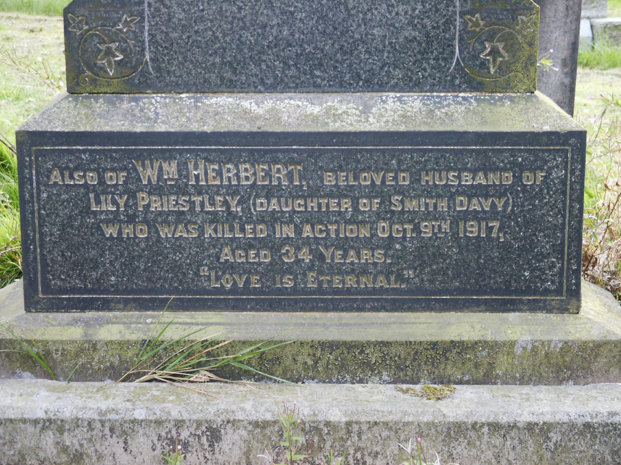 Oakworth cemetery: Also of Wm. Herbert, beloved husband of Lily Priestley, who was killed in action Oct 9th 1917. Aged 34 years. “Love is Eternal”