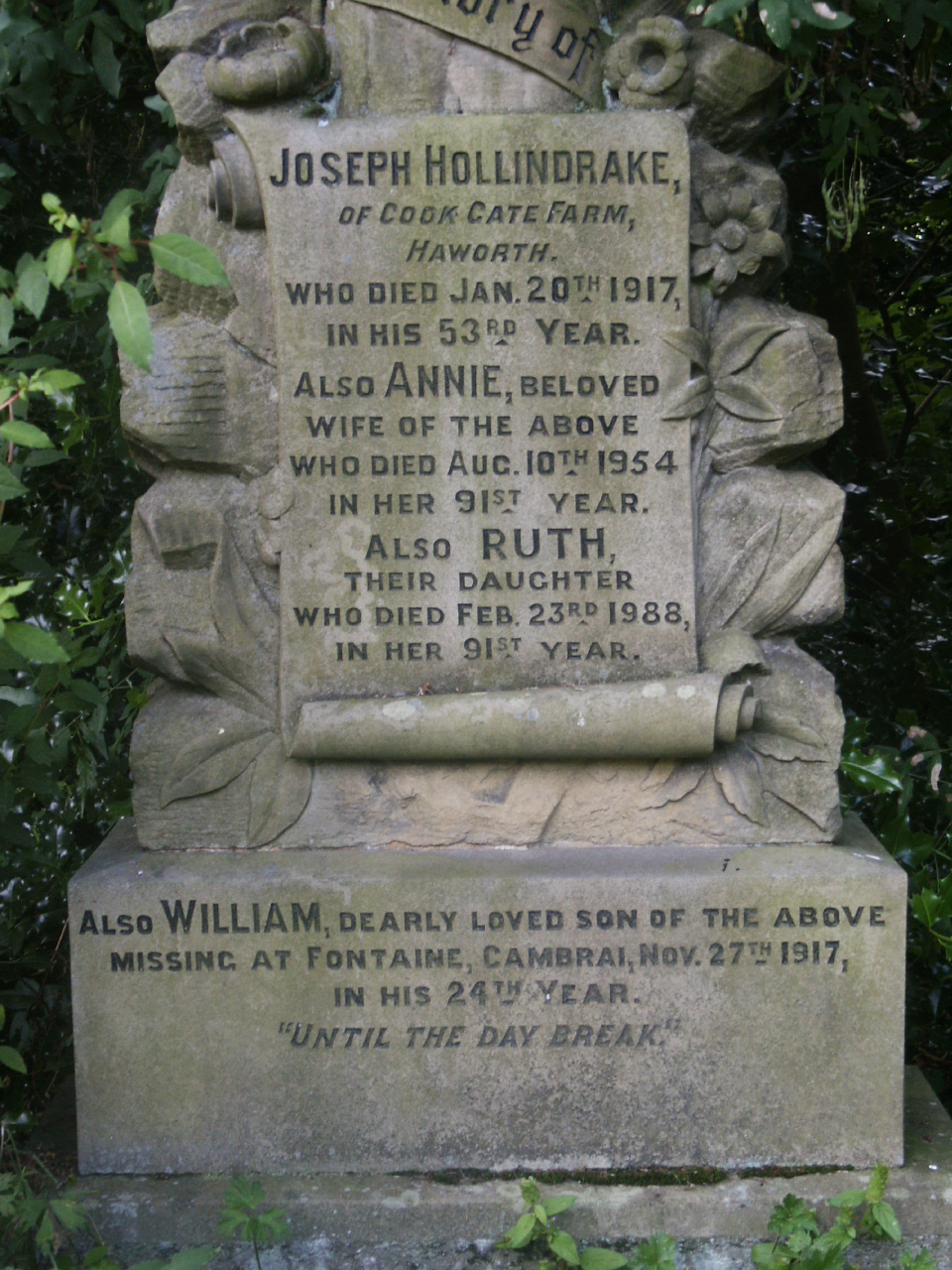 William was also named with a memorial inscription on the Hollindrake family grave which is in Haworth Cemetery.